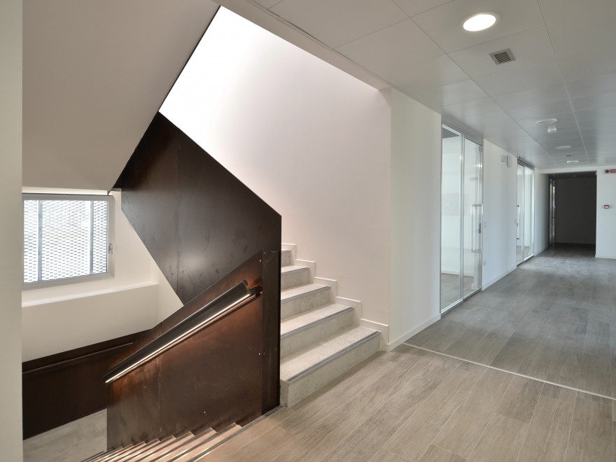 Due volumi tra loro connessi: il nucleo operativo costituito dal magazzino e la palazzina uffici, di forma compatta e disposta su tre livelli.
