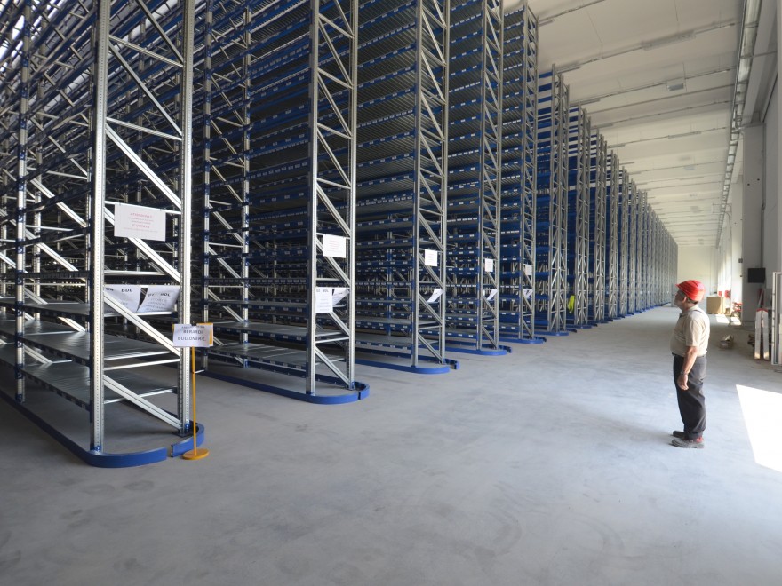 Il volume principale del magazzino è scandito da una serie di scanalature che, disposte in maniera apparentemente casuale, cancellano la ripetitività dei pannelli prefabbricati, creando persistenze di linee orizzontali che iniziano e si concludono senza una apparente logica costruttiva e strutturale.