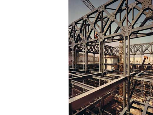 Ristrutturazione con adeguamento antisismico del Palazzo di Giustizia di Ancona. L'edificio in muratura conserva l'aspetto esterno, mentre le strutture interne sono state completamente ridisegnate e ricostruite con sistemi antisismici. La struttura portante verticale è caratterizzata da quattro torri in c.a., disposte ai vertici del cortile interno. L'ossatura portante in acciaio è caratterizzata da quattro tipologie strutturali: l'anello di travi tralicciate a cassone sostenuto dalle torri, il graticcio di travi tralicciate che copre il cortile, il coperto perimetrale in travi tralicciate ed i solai appesi all'anello.