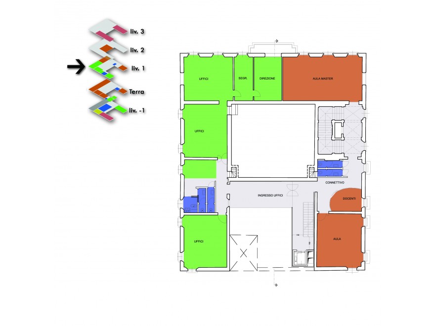 Lo studio distributivo prevede l’utilizzo dei locali interrati e la trasformazione della corte sud in accesso principale. L’eliminazione di tutte le superfetazioni consentirà l’inserimento di un nuovo volume nel quale sarà inserita la distribuzione principale dell’edificio. Il volume è composto da due parallelepipedi adiacenti. Un corpo “opaco” ospita il sistema dei collegamenti verticali costituiti da scala e ascensore, un corpo “trasparente”, contiene tre livelli di attraversamento e distribuzione. Il volume a triplice altezza dell’ingresso definisce l’ambito che precede lo spazio centrale nella Villa. La trasparenza e la percezione unitaria dei vari livelli contribuiscono alla connotazione architettonica dello spazio di ingresso.